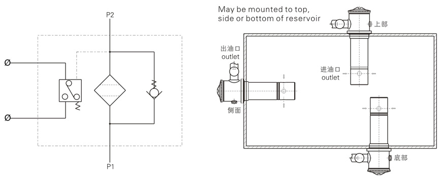 本過濾器可直接安裝在油箱側(cè)邊,底部或上部,過濾器頭露在油箱外,吸油筒體浸入油箱內(nèi)液面以下,出油口設(shè)有管式、法蘭式連接,過濾器內(nèi)設(shè)有自封閥等裝置,使管路省去裝截止閥等其它管件,從而使管路簡化,安裝方便。